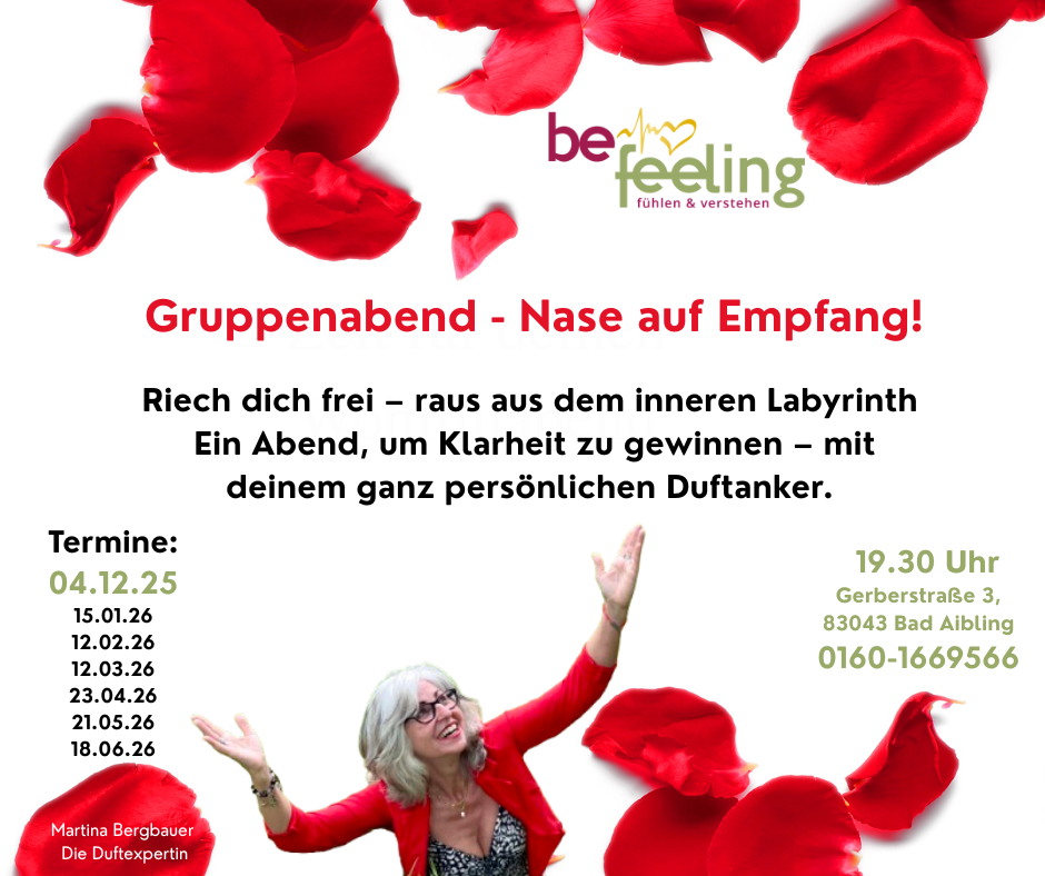 In einer warmen, achtsamen Atmosphäre verbinden wir die Kraft der Düfte mit energetischer Impulsarbeit, achtsamer Selbsterfahrung und tiefer, authentischer Begegnung.